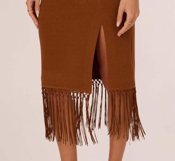 Trend-forward yet timeless, this fringe midi dress is a beautiful design. This cute dress features a sweetheart neckline, empire waist, tank straps, and a fringe midi skirt. Designed with a ribbed knit fabric, this fitted dress has a lot of stretch, making it a comfortable fit for most body types.With a slit at the side of the skirt and shirring at the bust – which has a bow appearance- this midi dress is a versatile look for casual and dressy events. A zipper closure at the center back completes this sleeveless dress. Styled with neutral or metallic accessories, this fringe dress isa boho look.|