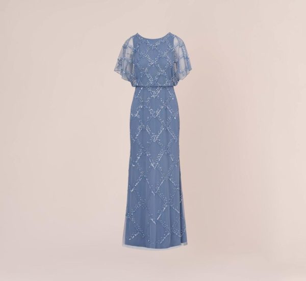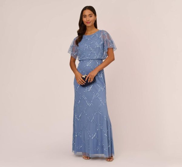 Hand-Beaded Blouson Long Gown With Flutter Sleeves In French Blue | Women Adrianna Papell Long Dresses