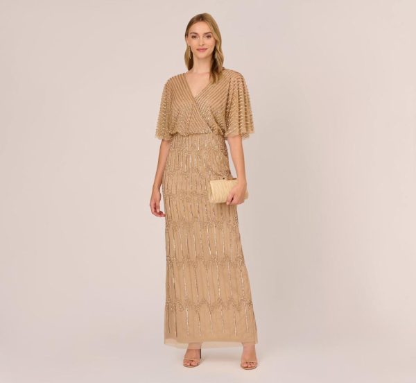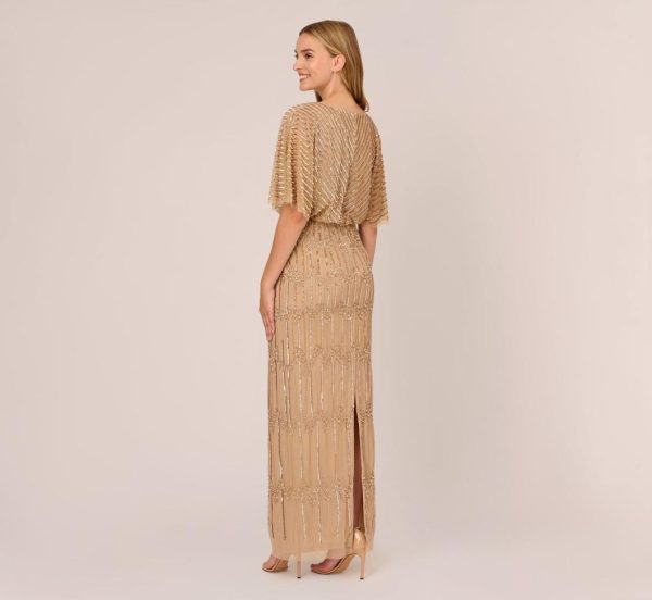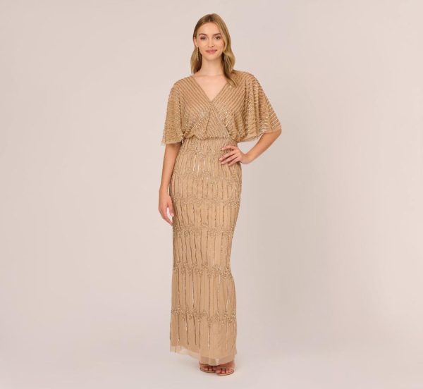 Hand-Beaded Illusion Long Column Blouson Gown In Champagne Gold | Women Adrianna Papell Long Dresses
