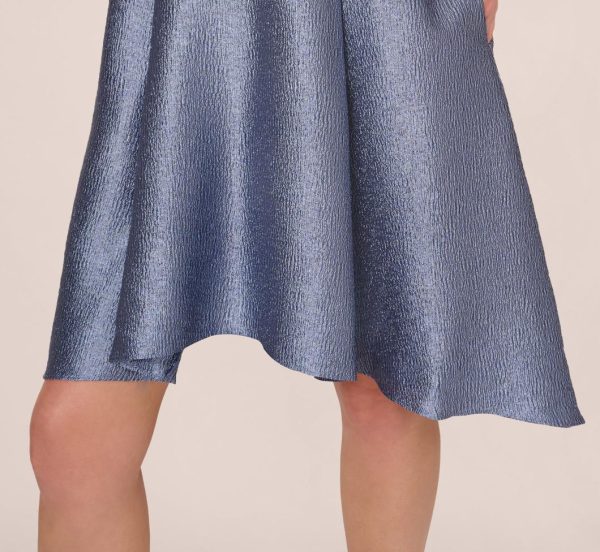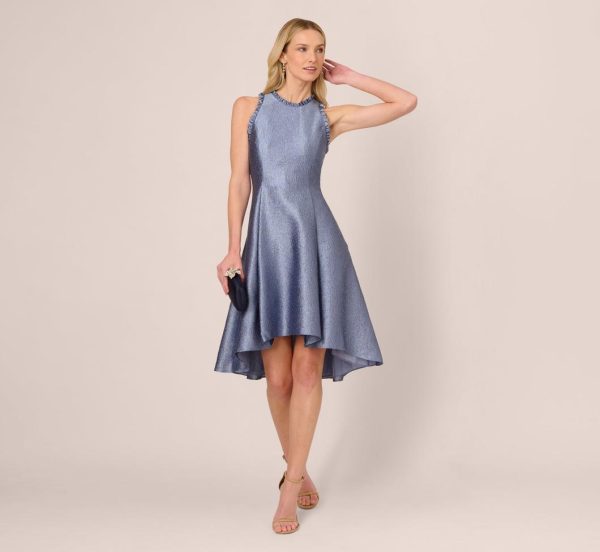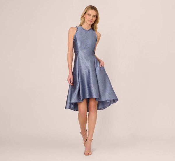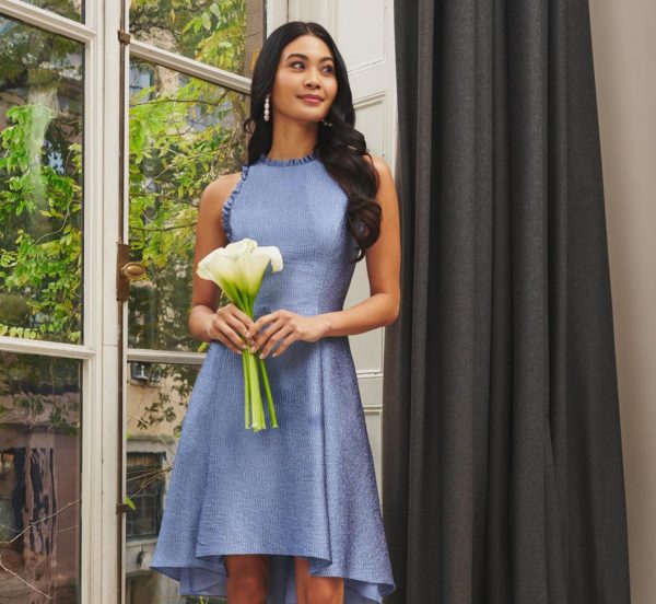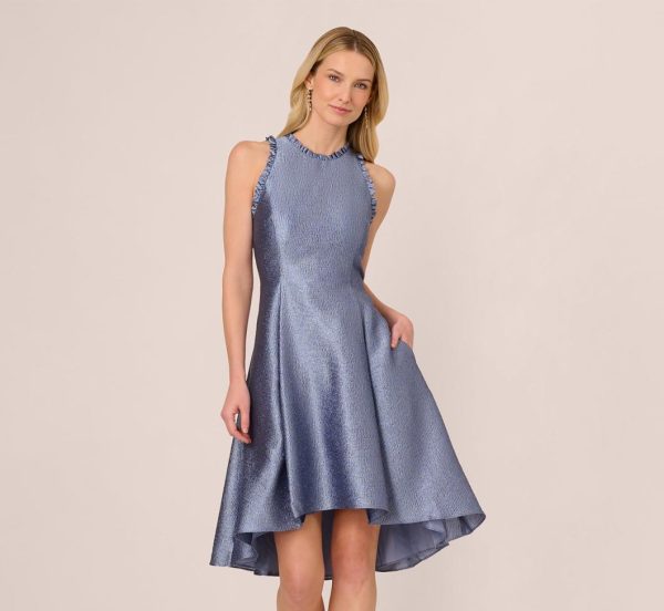 Softly textured jacquard fabric adds subtle dimension to this sleeveless blue cocktail dress with a high-low hem. The perfect fit-and-flare silhouette is achieved with princess seams that meet the skirt pleats at the waist. Ruffle details around the crew neck collar and shoulders create a face-framing moment. A back zipper and side pockets complete the look.|