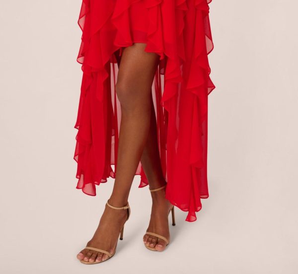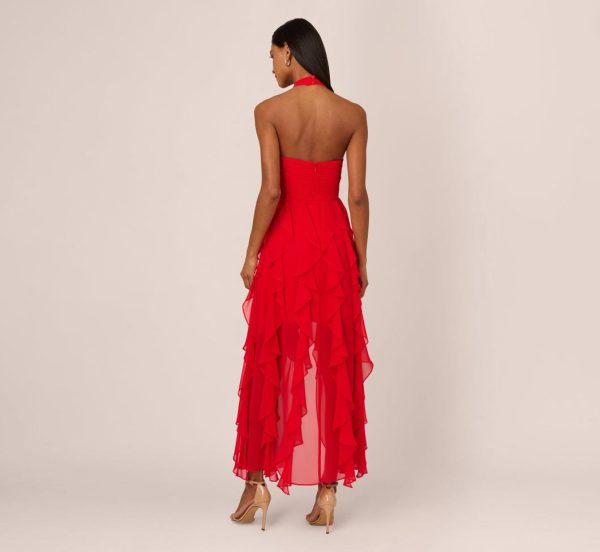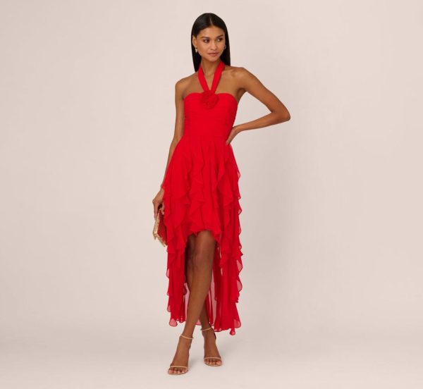 Make memories you won’t forget in this high low halter dress. This dress features a halter neckline, gathered bodice with a 3D flowers accent at the center of the bust, and a ruffled high low skirt. Crafted from mesh fabric, this dress has sultry sheer details at the skirt. This formaldress has an open back with covered button closure at the neckline and a hidden zipper at the center back. Pair this high low dress with nude heels and a dramatic clutch for a statement-making night out.|