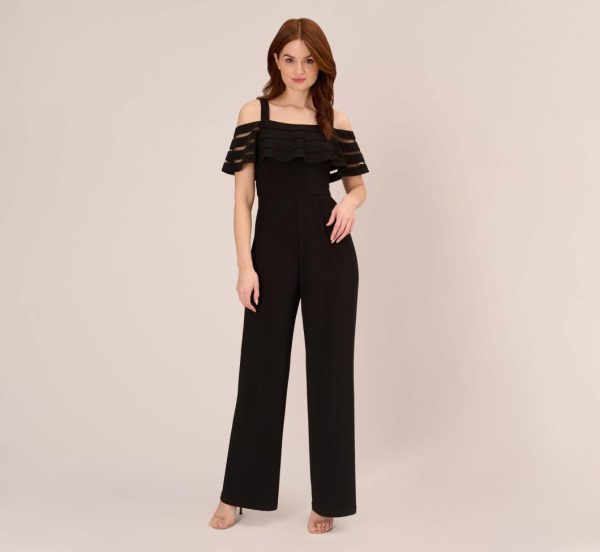 Our classic wide-leg jumpsuit crafted of an easy-fitting matte jersey is given an update with the off-the-shoulder banded ruffle with mesh inserts and bra-friendly wide straps. We’re obsessed with the flirty peek-a-book shoulders. All the details: square neckline and back hook-and-eye closure. Finished with a touch of stretch for a smooth, comfortable fit.|