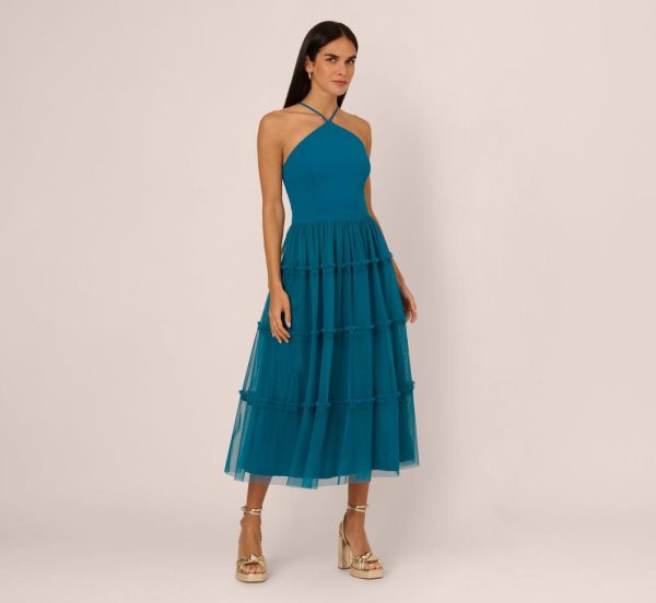 Knit And Mesh Tiered Midi Halter Dress In Peacock | Women Adrianna Papell Party