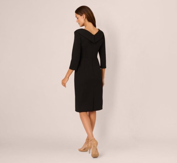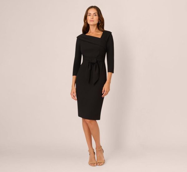 This three-quarter sleeve midi dress is a modern update to the everyday LBD with an asymmetrical collar in a draped design that frames your face perfectly. Slightly stretchy knit crepe and a back zipper create a fitted sheath silhouette and a tie front accent emphasizes adefined waist. Wear this above-the-knee black dress when you want a sleek and sophisticated look for cocktail hour, officewear, or special occasions.|