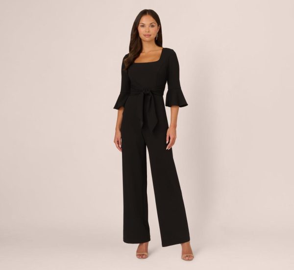 Your next night out just got more stylish with this wide leg jumpsuit. This jumpsuit features a fitted bodice with square neckline, three-quarter length bell sleeves, and wide legs. Crafted from knit crepe fabric, this jumpsuit has great stretch and is a figure flattering design. A self-tie front adds a pretty touch to this three-quarter length sleeve jumpsuit. A hidden zipper closure at the center back completes this wide leg jumpsuit. Nude heels and statement earrings are all this jumpsuit needs to shine for cocktail parties or formal events.|