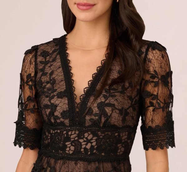 Soft and romantic details make this lace dress a feminine look. This A-line dress features a v-neckline, empire waist, and sheer elbow-length sleeves. Fully lined with nude fabric through the body, this dress is crafted from a sweet floral embroidered lace fabric. The soft skirt falls intiers and scalloped edging adds a delicate touch to the hems of this dress. A zipper closure at the center back closes this mid-length dress. Style this lace dress for the bride-to-be or on a night out with heels and a clutch to match.|