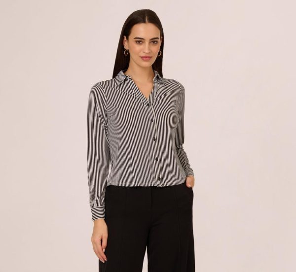 Refine your wardrobe with this polished striped top, crafted from crisp moss crepe fabric for a lightweight yet structured feel. The fine vertical stripe pattern adds visual texture, while the cropped length creates a contemporary edge. Designed with a classic collared neckline, cuffed sleeves, and a button-front closure, this versatile piece effortlessly transitions from office wear to evening outings.|