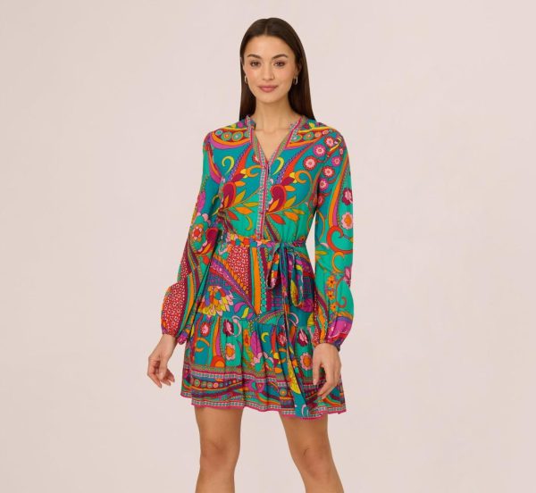 Bring a vintage vibe to your plans when you step into this long sleeve dress. This dress features a mandarin collar, v-neckline, and button up front. Crafted from woven rayon covered in all over retro abstract print, this dress boasts bishop sleeves, a soft skirt, and a self-tie waist. Dress up this short dress with knee-high boots for a look that will work in any season or rock it during the warmer months with rattan accessories. With this retro mini dress in your closet, the options are endless.|