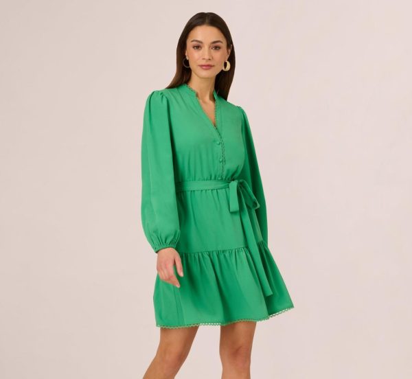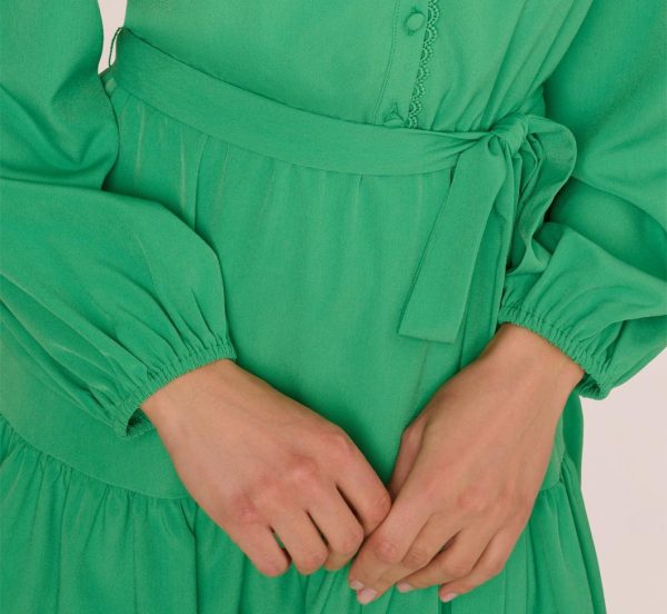 Gathered details and lace accents give this pretty green dress a cute, boho vibe. The bishop sleeves, A line flounce skirt, and gathering at the center of the back yoke create a soft, feminine silhouette. Scalloped lace trims the hem, band collar, and front button placket. The waist is defined with a matching tie belt. Perfect for brunches, picnics, and outings with friends, this breezy dress will be a new favorite in your closet.|