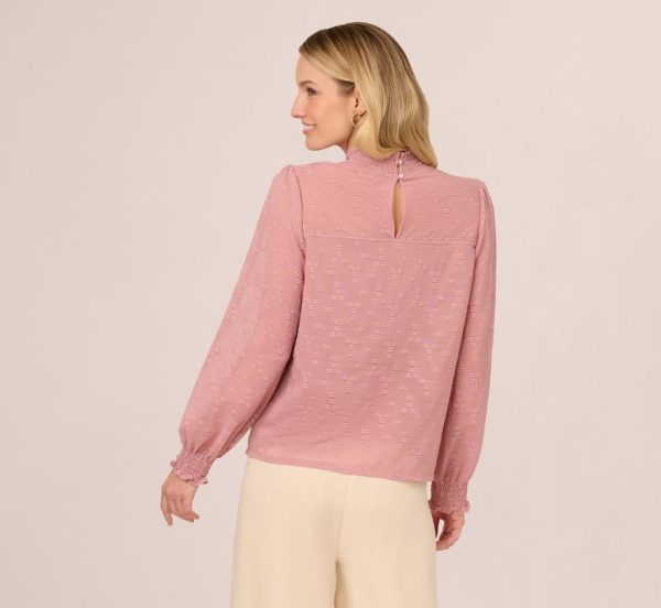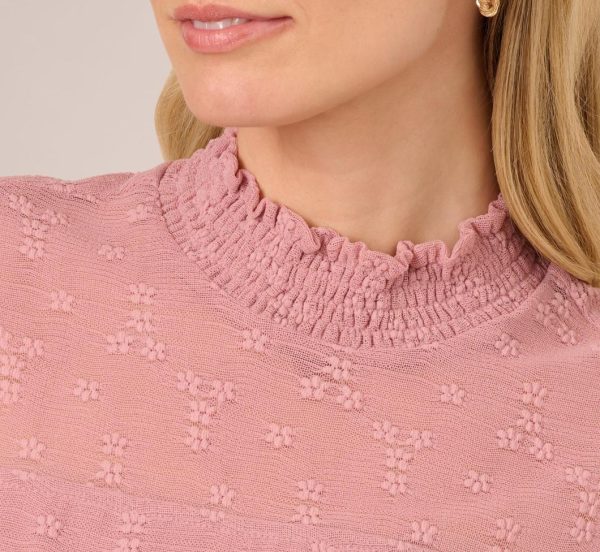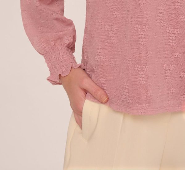 A floral design knit into sheer fabric gives this pullover top soft texture and depth. Smocked details at the cuffs and the mock neck add structure to the design. The back is finished with a keyhole closure at the collar. An inner half lining makes this sheer top effortlessly wearable for a polished everyday look.|