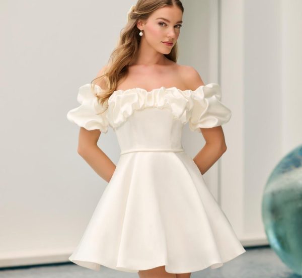 Mikado has been used to create this sculptural off the shoulder neckline on this full skirt, short dress. The skirt is semi-circle cut for a flirty, full look.