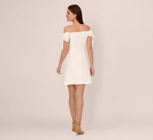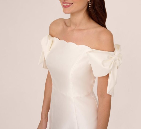 Oversized bows at the sides of the off-the-shoulder straps give this little white dress its cute, festive flair. The neat sheath silhouette is achieved with carefully tailored princess seams and a back zipper closure. Constructed in crisp Mikado fabric, this enchanting dress appears subtly luminous with a lustrous finish. The scalloped neckline adds a face framing moment. This cocktail dress is a versatile staple for going out looks, perfect for summer parties, winter whites, or even a city hall wedding ensemble.|