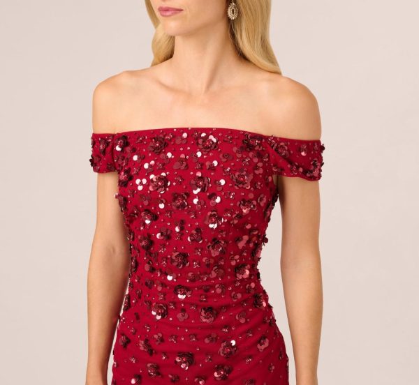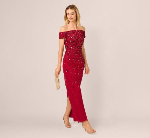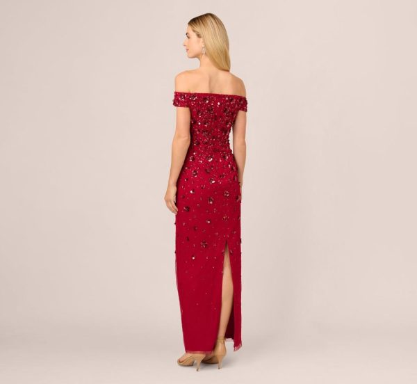 Feminine and fabulous, this special occasion dress features a romantic off-shoulder neckline, a floral embellished bodice, and a long, straight skirt with a back slit, and back zipper closure. Take on your next formal in style with this stunning evening dress. Whether for a wedding, gala or other black-tie event, you can’t go wrong with a party dress this polished. Wear this formal dress with sparkling chandelier earrings, a chic, metallic clutch, and a sexy pair of strappy heels for a glamorous look that is sure to shine. Beading and embellishments on this garment were sewn by hand, making each dress beautifully unique. Slight variations or irregularities may be present.|
