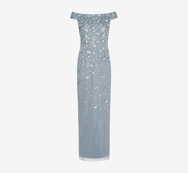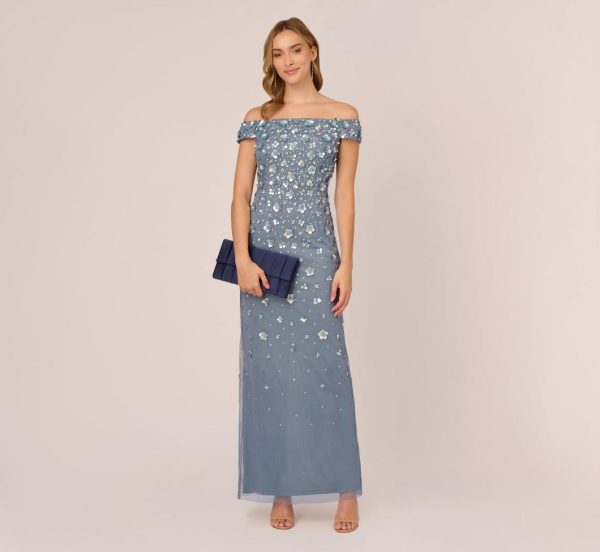 Feminine and fabulous, this special occasion dress features a romantic off-shoulder neckline, a floral embellished bodice, and a long, straight skirt with a back slit, and back zipper closure. Take on your next formal in style with this stunning evening dress. Whether for a wedding, gala or other black-tie event, you can’t go wrong with a party dress this polished. Wear this formal dress with sparkling chandelier earrings, a chic, metallic clutch, and a sexy pair of strappy heels for a glamorous look that is sure to shine. Beading and embellishments on this garment were sewn by hand, making each dress beautifully unique. Slight variations or irregularities may be present.|