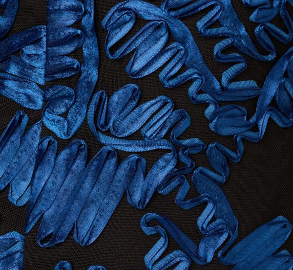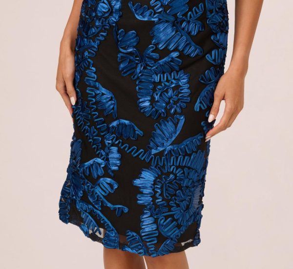 Soutache is the traditional textile technique of stitching down ribbon to create textured patterns on your fabric. We updated this timeless look with a modern sheath dress silhouette and a foldover off-the-shoulder collar and sleeve design. A back zipper closure ensures a skimming fit. For a subtle and sophisticated moment on your next night out, you’ll love this black and navy blue cocktail cocktail dress.|