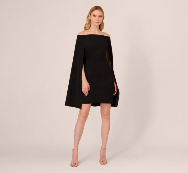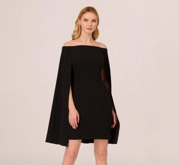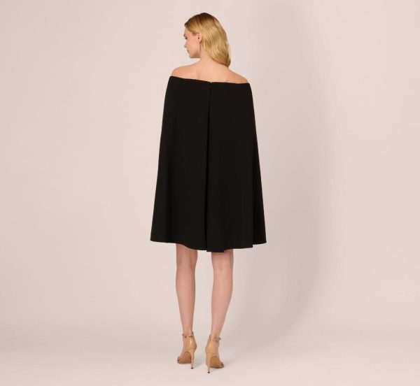 This gorgeous cape dress knows how to bring the drama. Featuring an off the shoulder neckline, a relaxed sheath fit, and a flowing yet structured cape, this modern dress looks like it’s been plucked off the red carpet. Crafted from stretch crepe, this fitted dress has a comfortableamount of stretch. The cape is split at the back to create beautiful movement. A zipper and hook and eye closure finishes the look. Paired with your favorite heels and statement earrings, this off the shoulder dress is a crowd pleaser.|