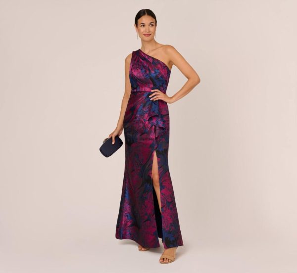One Shoulder Jacquard Mermaid Gown With Drape Detail In Navy Orchid | Women Adrianna Papell Black Tie Dresses