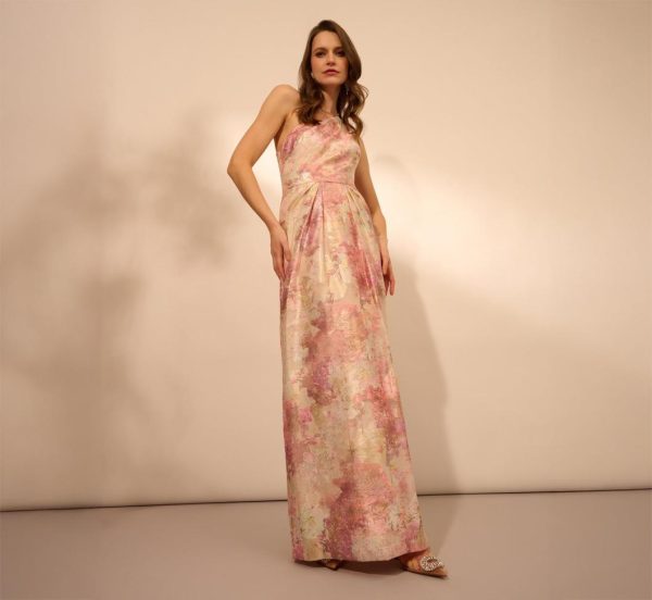 Elevate your evening look with this sophisticated jacquard gown, featuring a soft abstract watercolor print. Designed in a structured slim column silhouette, this dress creates its sleek lines with a well tailored fit. The one shoulder neckline adds an elegant asymmetrical touch, while pleated details at the shoulder and hips create an elegant sculptural effect. A discreet side zipper closure ensures a seamless finish. Perfect for formal and black tie occasions, this gown is a statement in refined beauty.|
