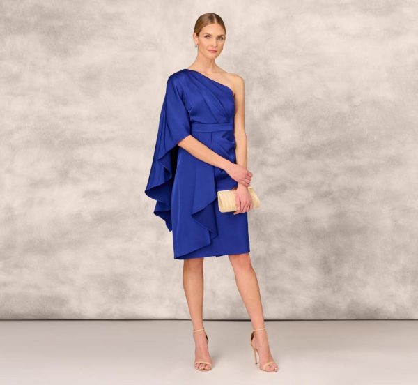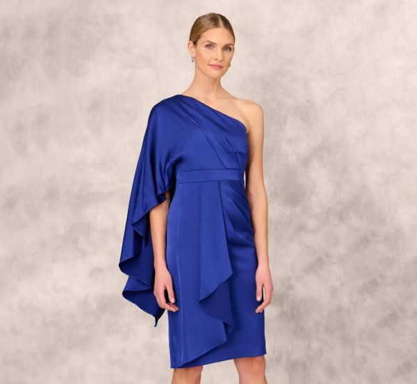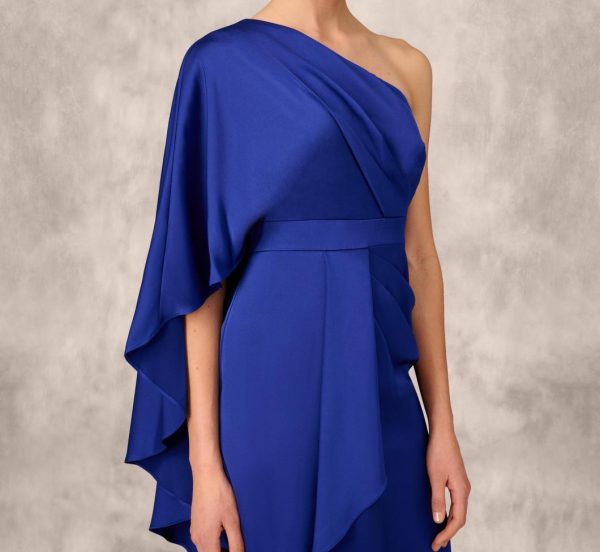 One-Shoulder Satin Draped Sheath Dress With Crepe Back And Cape In Roy | Women Adrianna Papell Party