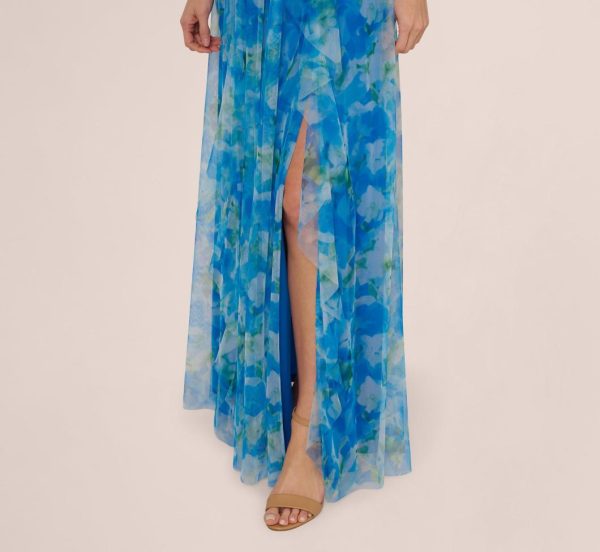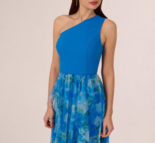 This stunning blue gown combines contemporary elegance with timeless craftsmanship, featuring expertly tailored details that create a beautifully refined silhouette. The structured knit one-shoulder bodice showcases princess seams and a discreet side zipper for a flawless fit, while the graceful mesh A-line skirt flows effortlessly from the waist. Delicate ruffle accents cascade down the front of the exquisite floral watercolor print skirt, creating a mesmerizing movement with every step. Make a breathtaking entrance at your next formal event or special occasion in this show-stopping gown that promises to leave a lasting impression.|