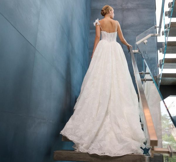 This is a stunning ball gown made out of floral all over lace with glitter mesh underlayer. Semi-sheer bodice with a scooped neckline, beaded spaghetti straps and beautiful lace feature on one shoulder.