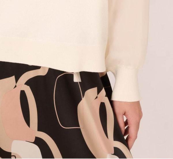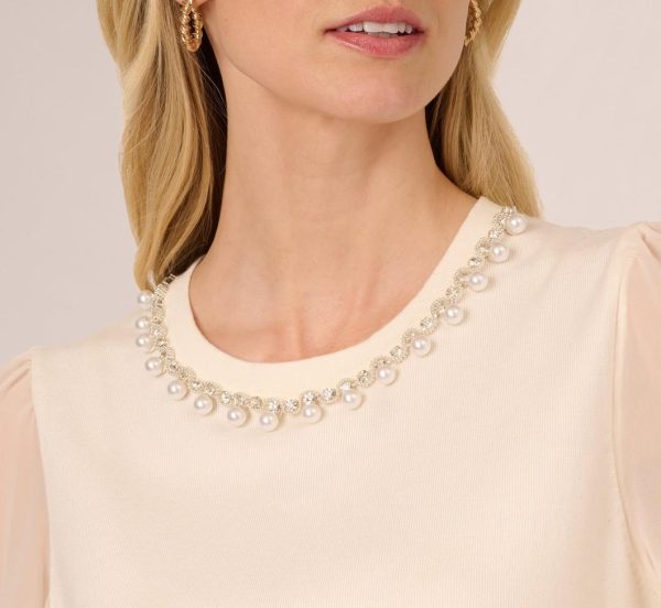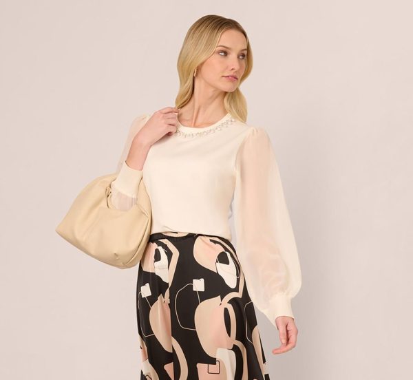 Rhinestone and faux pearl trim around the collar of this cute pullover sweater creates a sparkling jewelry-like effect. The luxe look is complemented by the sheer chiffon bishop sleeves. With rich depth and texture, this sweater is perfect for a dressy office look or a Saturday afternoon out with the girls.|