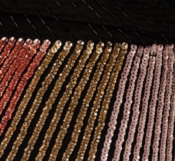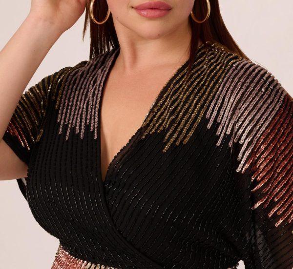 A beloved daytime silhouette sparkles for evening in this stunning faux wrap dress. This dress features a surplice bodice with v-neck, loose dolman sleeves, and a wrap skirt. Crafted from mesh fabric and covered in a mix of multicolor sequins and beading throughout, this fully-lined dress is a figure-flattering look. A hidden zipper closure completes this cocktail dress. Neutral heels and trend-forward accessories will make this beaded dress sparkle even more.|