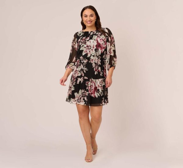Plus Size Floral Chiffon Dress With Three Quarter Length Sleeves In Bl | Women Adrianna Papell Work Dresses