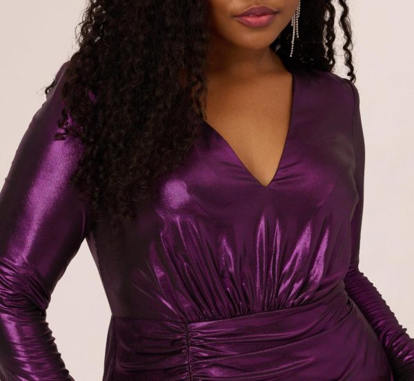 Ready to shine? This ruched dress is ready to hit the town. This cocktail dress features a fitted bodice with a v-neckline, long sleeves, shoulder pads, and a gathered asymmetrical skirt. Designed with a glam metallic knit fabric, this semi-formal dress has ruching throughout the body. A zipper closure at the back finishes this metallic dress. Let this party dress shine with a nude heel or neutral pump and a statement-making clutch.|