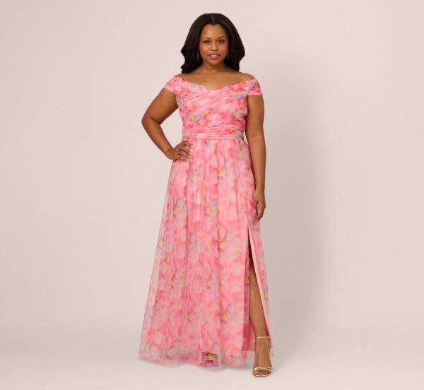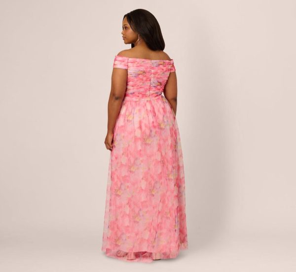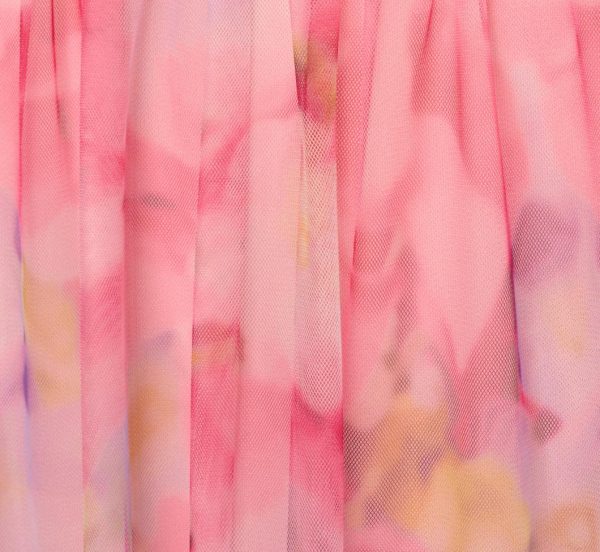 Elevate your special occasion style with this gorgeous pink maxi dress. Featuring flowy tulle fabric in a soft A-line silhouette, this long gown features a beautiful abstract watercolor print in shades of pink with accents of blue and yellow. Pleated details on the bodice and straps add subtle texture to the design. The high waist and off-the-shoulder straps create a classic silhouette, while the back zipper ensures a perfect fit. Make a statement at any event with this elegant gown.|