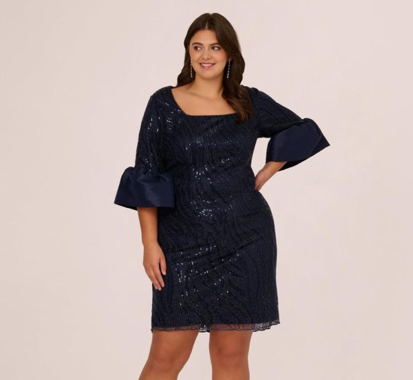 Perfect for cocktail attire and semi-formal events, this sequin dress is a sweet little style. This party dress features a sheath silhouette, square neckline, and three-quarter bell sleeves with taffeta cuffs. A swirl of sequins on elegant lace elevates this sheath dress. A zipper closure atthe center back completes this design. Styled with nude heels and statement earrings, this bell sleeve dress is a memorable look.|