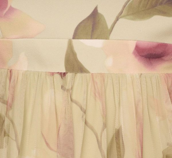 A soft floral pattern gives this pretty midi dress a timeless look. The square neck bodice features princess seams and a back zipper closure for a fitted silhouette. The mesh fabric skirt flares at the waist in four gathered tiers for a flowing effect. This gorgeous dress is the perfect look for all your parties and celebrations.|