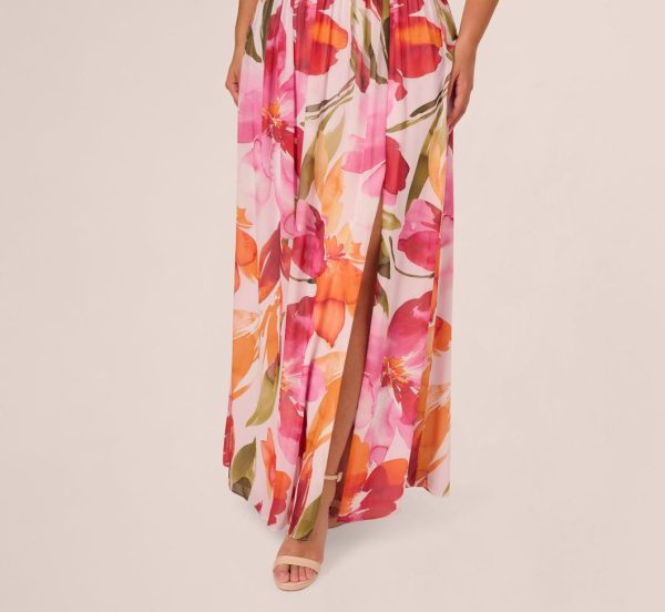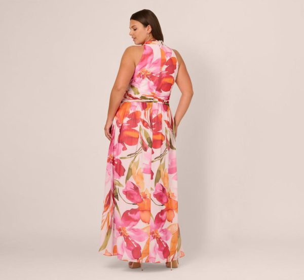 Plus Size Sleeveless Surplice Floral Chiffon Gown In Pink Orange Multi | Women Adrianna Papell Printed Dresses