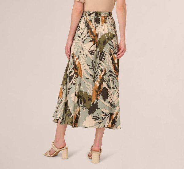 Sunny and breezy, this midi skirt will become your new favorite for styling warm weather work and weekend ensembles. An abstract botanical inspired print in neutral earthy tones adds depth to the design. The full A line cut is gathered at the waist for a flowing silhouette, complete with a side slit for extra movement. An elasticized back panel on the waistband makes this pull on style exceptionally comfortable and easy to wear.|