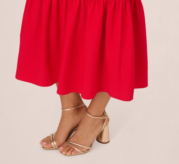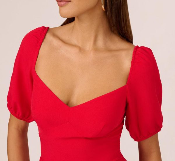 From a day at the office to brunch with friends, this puff sleeve midi dress is a playful choice. This dress features a fitted bodice with sweetheart neckline, puff sleeves with elastic cuffs, a fitted mid-length skirt is contrasted by a flounce hem. Designed with polyester fabric that has minimal stretch, this short sleeve dress is a boho chic look. A zipper closure at the center back completes this midi dress. Styled with sandals and a raffia clutch, this day dress is a dreamy look.|