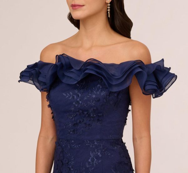 Ruffle Off The Shoulder Floral Lace Gown In Light Navy | Women Adrianna Papell Printed Dresses