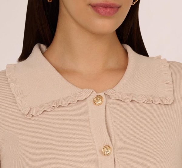 This sweet little cardigan sweater features an ultra-soft knit fabric for a cozy feel. The collar is a square sailor-style design finished with cute ruffle trim. Metallic buttons down the front and on the faux pockets add a luxe touch. Layer over a dress for the office or pair with jeans for days off.|