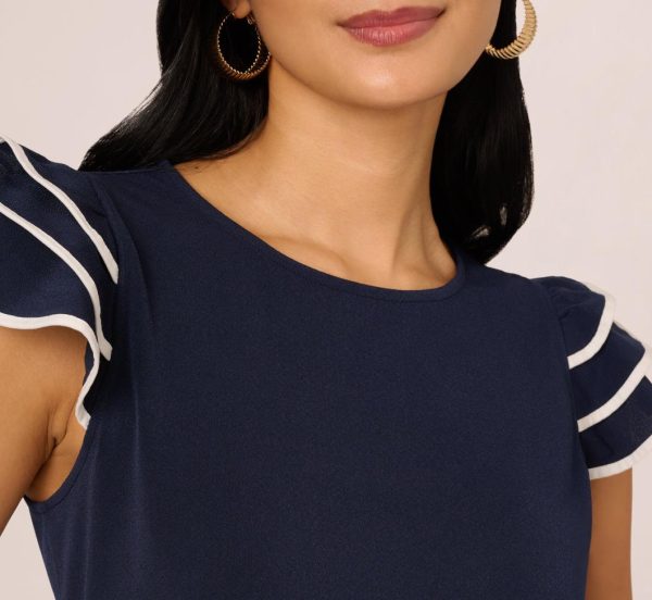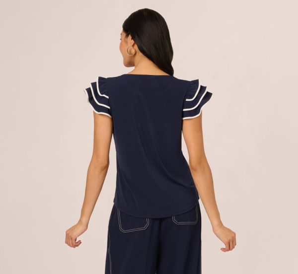 This effortless cap sleeve top gives any outfit a cute but polished look. Three tiers of contrast tipped ruffles at the shoulders create a pretty face frame and add dimension to the design. The soft knit fabric gives the top just the right amount of drape and the pullover construction makes it super easy to wear. Perfect for everyday ensembles, this versatile top pairs just as well with casual denim as with a tailored pencil skirt.|