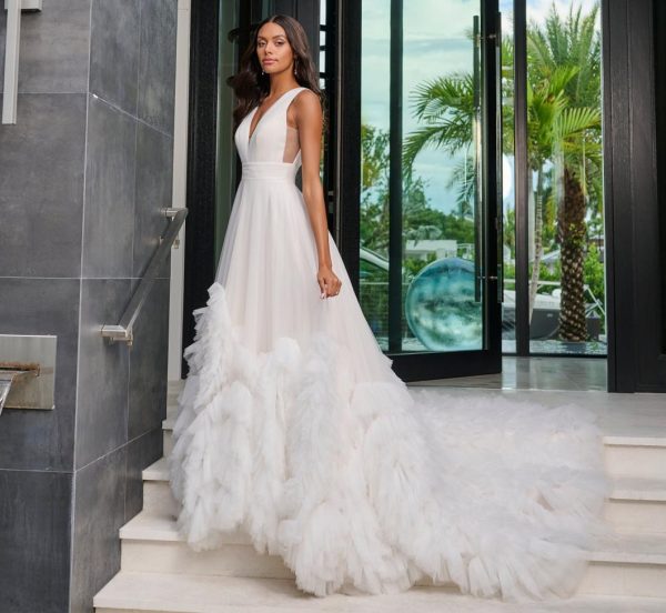 Tulle has been delicately pleated on this deep v bodice and then wrapped around to hug the waist on this ethereal, soft A-line gown. Light layers of ruffled tulle and been hand placed and grow upwards from the hem, creating modern skirt drama.