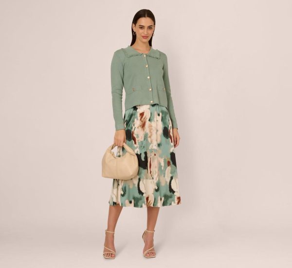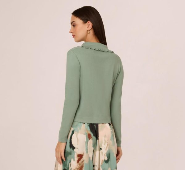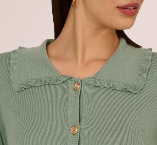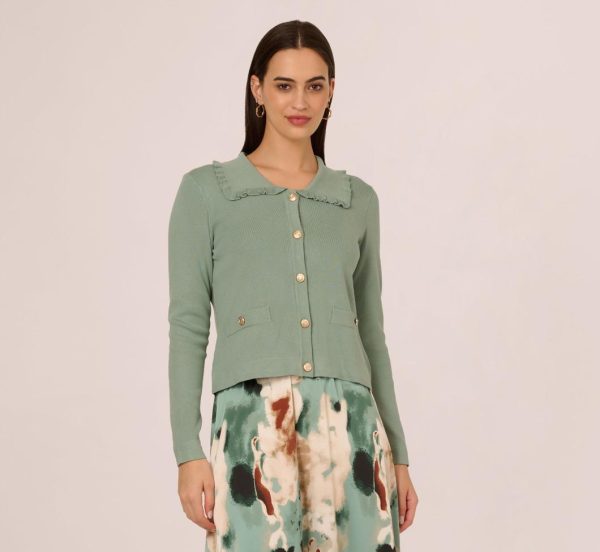 This charming cardigan sweater features an incredibly soft knit fabric that provides exceptional comfort and warmth. The distinctive square sailor-style collar is beautifully accented with delicate ruffle trim for a feminine touch. Elegant metallic buttons along the front and decorative faux pockets add sophisticated detailing. Perfect for layering over dresses for professional settings or pairing with jeans for casual weekend wear.|