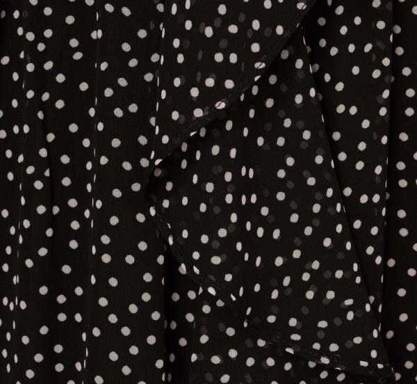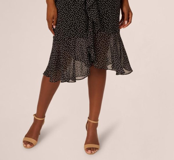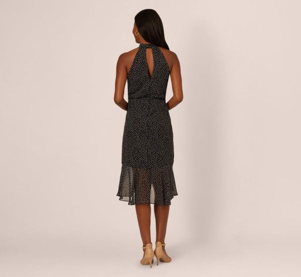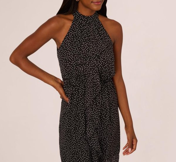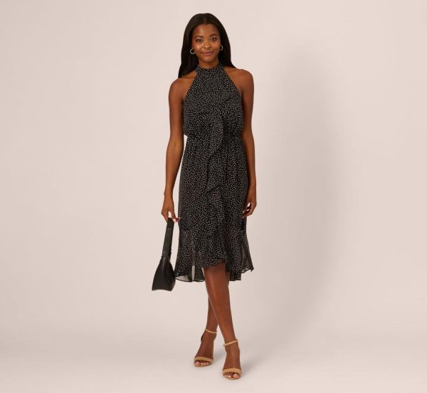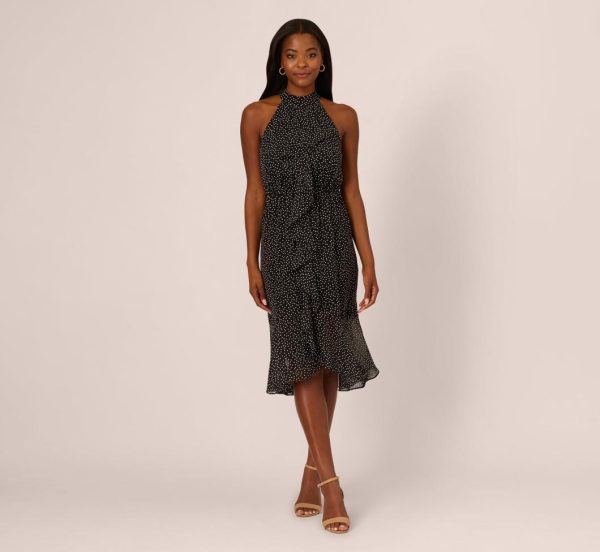 A ditsy dot pattern gives this women’s midi halter dress subtle visual dimension. A ruffle cascades down the front from the mock neck collar to the flounced hem, adding movement to the design. The waist is defined with stretch shirring and the keyhole back is finished with a zipper closure. If you’re looking for classic sophistication and polished charm, you’ll love this timeless tea length dress.|
