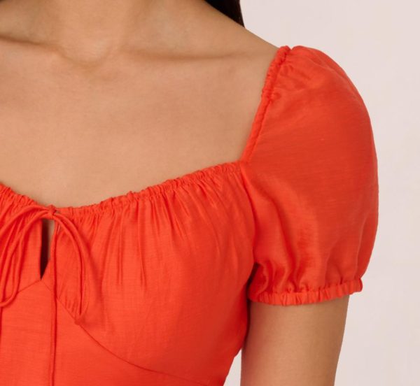 Brighten all of your plans when you rock this cute puff sleeve dress. This day dress features a fitted bodice with a shirred bust, puff short sleeves with elastic cuffs, a sweetheart neckline, and a flared skirt. Crafted from woven rayon fabric with light sheen, this fit and flare dress has limitedstretch and a hidden zipper back closure. A pretty look for daytime events or date night, the bust of this dress features an adjustable, self-tie accent and keyhole cutout. Paired with nude heels and rattan accessories, this short sleeve dress is a sweet look.|