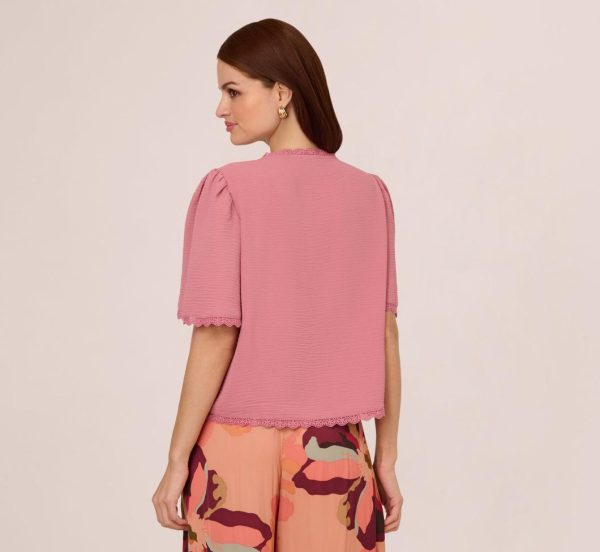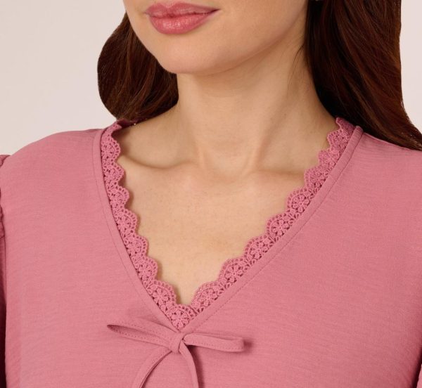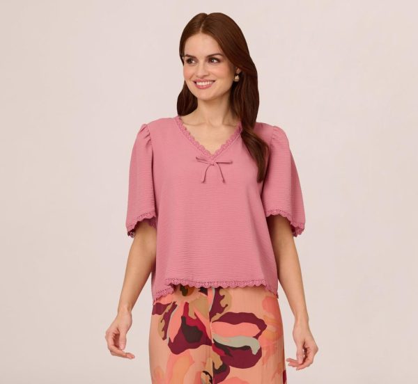 Textured airflow fabric and delicate crochet lace trim along the hem, collar, and cuffs give this top its breezy boho feel. A bow detail at the center of the V-neck adds a sweet and romantic touch. The sleeves hit just above the elbow for extra coverage. This lovely relaxed fit top creates a moment of softness in any outfit, whether you’re getting ready for a day at the office or a casual date night.|