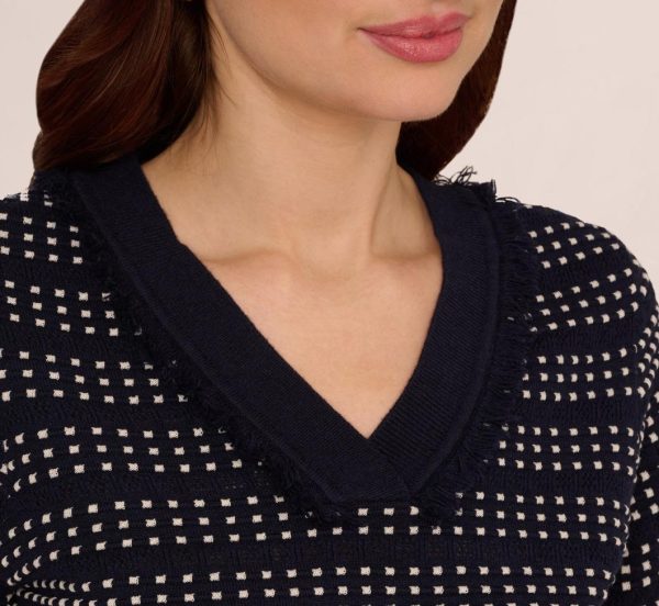 A relaxed fit and a textured grid pattern knit into the fabric gives this short sleeve sweater a soft contemporary look. Fringe trim along the V-neck collar and the sleeve cuffs adds a boho touch. Dynamic yet classic, this effortless sweater top looks just as good with slouchy jeans as it does with a smart pencil skirt.|