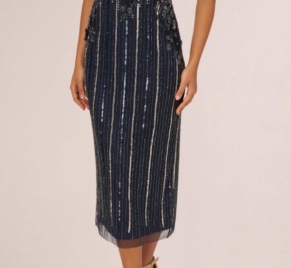 This sleeveless ankle length dress features a boat neck and a column silhouette, with a back zipper for easy wear. The allover linear sequin embellishment adds a moment of modern elegance, while the 3D beaded flower details over the bodice create a unique sparkling texture. Perfect for formal events and special occasions.|