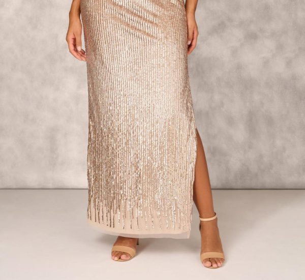 Sleeveless Beaded Column Gown With Illusion Neckline In Champagne | Women Adrianna Papell Long Dresses