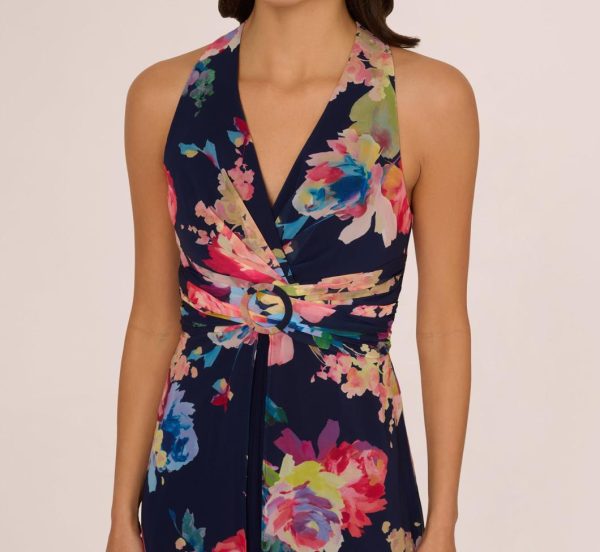 This sleeveless jumpsuit matches elegance with modern flair. The floral chiffon bodice features a surplice neckline and narrow halter-like shoulders for a sleek, flattering fit. A pleated waist detail, accented by matching O-ring hardware, defines the silhouette. Flowing from the waist, the wide-leg crepe pants are elevated by the chiffon split-skirt overlay, creating graceful movement with every step. Finished with a back zipper closure for a seamless fit, this jumpsuit is perfect for special occasions and statement-making moments.|