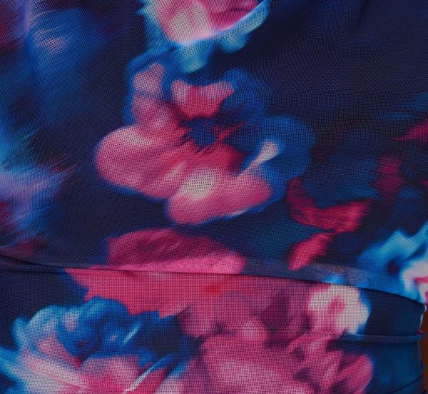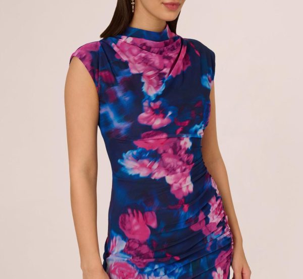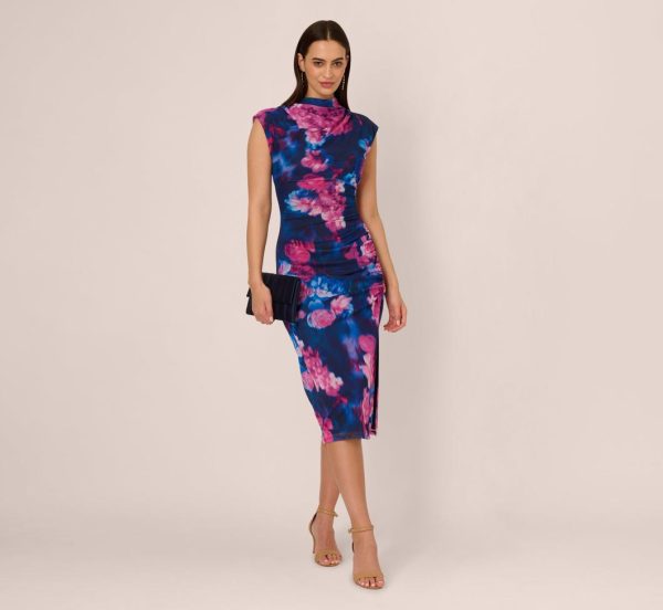 Bright florals give this sleek midi dress its rich, lush look. A high draped neckline and a ruched side seam add texture and dimension to the design. The stretch mesh overlay construction creates a bodycon silhouette with a back zipper ensuring a perfect fit. Modern yet feminine, this pretty dress will quickly become your new favorite.|
