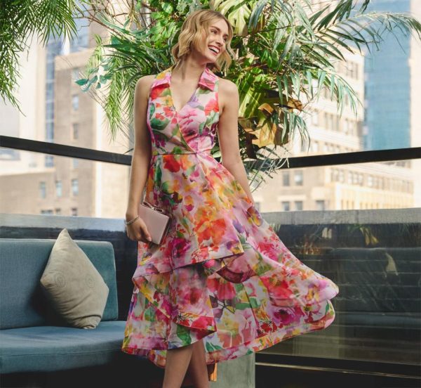 Pretty and polished, this colorful fit-and-flare dress is constructed in floral organza fabric for a soft but structured look. The draped high low skirt creates dramatic dimension and the collared surplice neckline gives you a face-framing moment. A back zipper closure ensures the perfect fit. Designed for celebrations and special moments, this floral midi dress is ready for every party.|