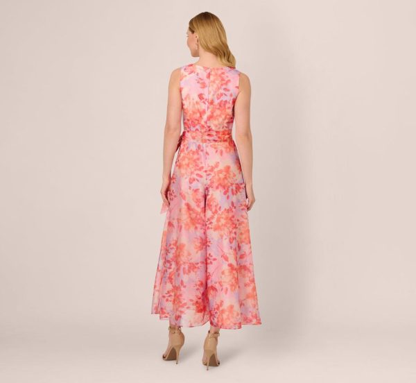 Embrace effortless elegance with this floral organza jumpsuit. The refined faux wrap neckline with a wide waist tie belt define your silhouette beautifully while adding a touch of sophistication. The wide-leg cut offers graceful movement, perfect for any special occasion. Featuring a back zipper closure for easy wear, this jumpsuit combines romantic charm with modern style in lightweight flowing fabric.|